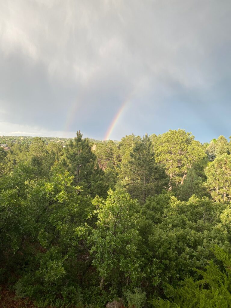 After an hour, she has devoured two fast-paced chapters, and the storm is ending, but her gaze is back in the sky, and blue sky is now taking over, led by its’ brilliant giver of life.  She then jumps up quickly, looking out to the west and she found what she was waiting for:  Bright rainbows slicing the blue sky in bright colored arcs, and then, there were two!  She snapped a picture, then looked out across the canyon, and saw a neighbor man, also looking across his deck at the rainbow.  Although distant, their eyes met and she saw he had a glass of wine, so they waved at each other, pointed at the rainbow, and toasted each other with their wine glasses, now refreshed with the sweet ozone smell of a thunderstorm now gone, and a connection neither one of them thought they had.