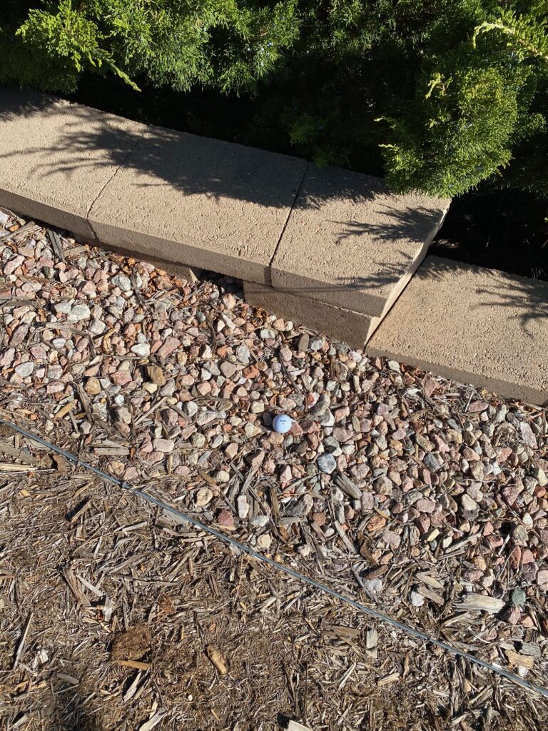 Well, here it is: I found a Nitro 4 ball in the stones in my front yard, this time, near the street, and then while watering my bushes, found another one, a Callaway, hidden under the branches of the bush, and I probably would not have found it unless I was watering.